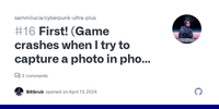 I'm trying to take photos but every time I attempt to use the screenshot function it forcibly makes my PC restart. I do have a couple of appearance mods; I've seen older posts claiming Cyber Engine Tweaks causes photo mode crashing, but I'm not sure how that could be fixed besides getting rid of my few mods.