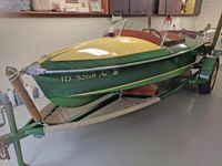 A unique and innovative builder, Mullins was, at one time, America's largest production boat builder. The Mullins Steel Co. built a variety of row boats, duck boats, canoes, launches, outboards, and runabouts. The Sea Eagle was a 15'9 inboard model produced between 1931 and 1939. Constructed using pressed-steel, the boats were advertized as puncture proof and non-sinkable due their integrated sealed air chambers! The 1932 production models were guilded in a striking green and yellow color scheme. Mullins was also one of the first manufacturers to build their own trailers , using a Ford axle an