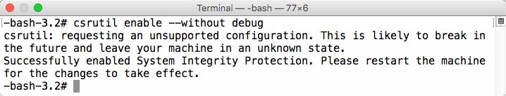 csrutil disable; rebootand press EnterTo ENABLE SIP: type