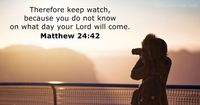 Matthew 24:42 Therefore keep watch, because you do not know the day on which your Lord will come.