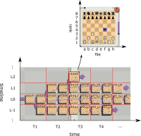Now you can see all four dimensions represented visually. Let us call these little chessboards planes. Every plane in itself is two-dimensional 8 by 8 square, but each plane can also have planes adjacent to it. Dimensions inside a given plane are spatial dimensions, and dimensions displayed on a larger scale are two temporal dimensions. Planes to the left are located in the past, planes to the right are located in the future, planes in the upper part of the screen belong to an earlier timeline and planes in the lower part of the screen belong to a later timeline.