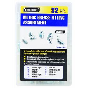 Have the right-sized zerk grease fitting on-hand for tractors, lawnmowers, and other machinery with this quality set. Each of these zerk grease nipples is constructed out of tough zinc-plated steel. Includes a divided storage case and identification chart.